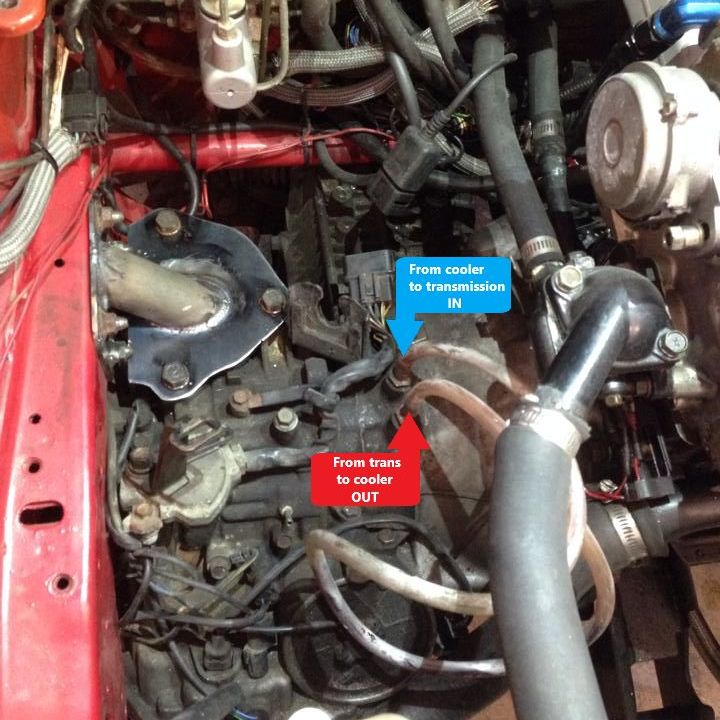 The port closest to the firewall is the cooler return. This is where transmission fluid comes from the transmission cooler back into the transmission. The port closest to the radiator of the car is the cooler feed. This is where transmission fluid comes from the transmission and goes to the transmission cooler.