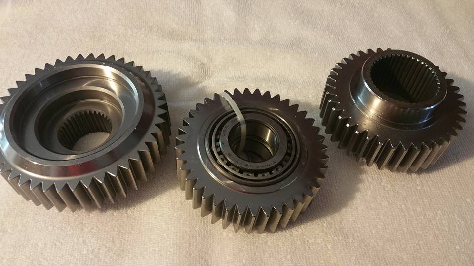 These are gears that transfer the power in the transmission. Stock these gears are prone to cracking if pushed to hard. The bad thing is when these crack they take out the case, and have even locked up the drive train. You can do things to the stock transfer gears to help prolong longevity like running a quality transmission fluid and/or having them shotpeened and REM Isotropic finished. The stock gears are usually a ticking time bomb and carry a serious potential safety warning. If your transmission has stock gears but it whines like it has straight cut gears then your transfer gears are cracked. If you truly want a long lasting and good performing transmission these are really important. If you plan to launch your car occasionally or more then these are heavily recommended. In fact most of the failures come from stalling the car for a launch because your trying to hold so much torque back. If you are upgrading the brakes to hold the car back then that is a good indicator that you need billet straight cut transfer gears as its guaranteed that it will break the OEM transfer gears sooner or later. Also remember helical cut gears are designed to reduce noise. As a byproduct of reducing noise it heavily promoted deflection. The Billet straight cut transfer gears are a product of JB Designs. They offer these in Standard and 7% overdrive. Get standards unless you have either 800+ HP or have a stroker in which you should get the 7%.