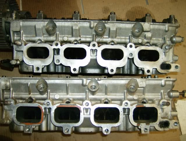 Here is an example of the large port and small port cylinder heads next to each other. As you can see the difference in runner sizes between the two. The larger port volume of the large port head has an effect on low end to mid range power but really shines on mid range to top end power. This is due to port velocity. The more power you make the better the large port head compliments the setup. Usually race 2g heads end up ported out to large runner size. The small runner has a smaller port with a differ port shape that has a higher angle to the valve and like mentioned has higher port velocity and that is what helps the low end to mid range power. That is what helps stall converters. (cont below)