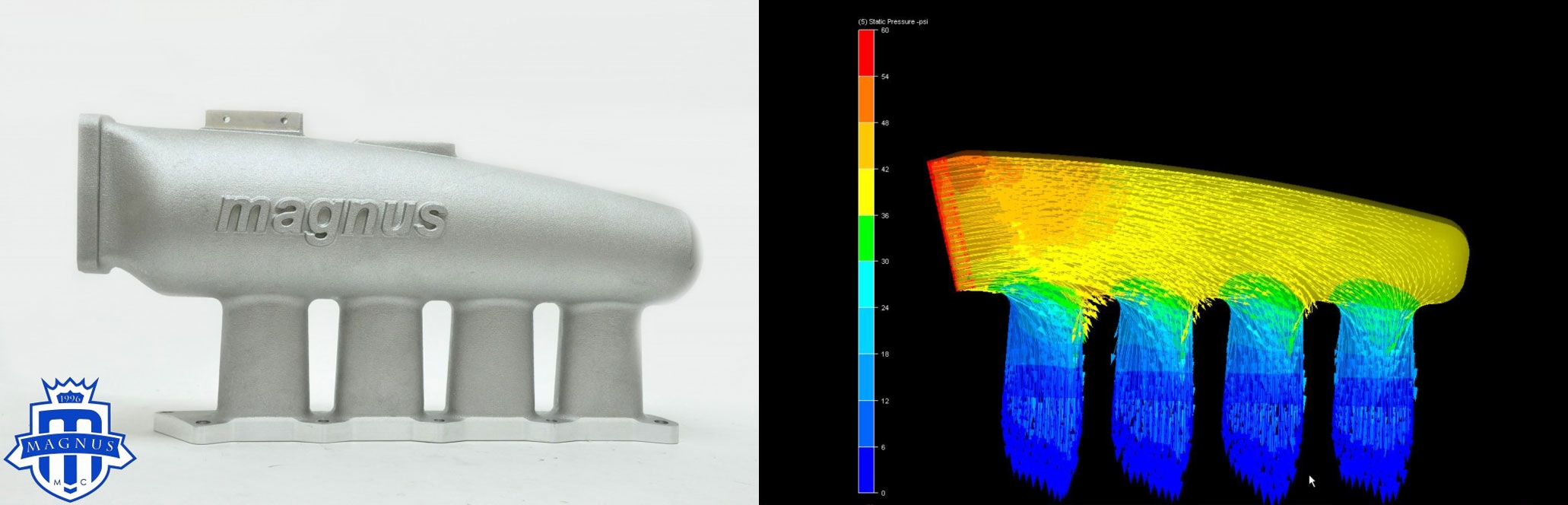 After endless hours dedicated to creating prototypes, testing and perfecting we had reached the results that we were looking for. The result that we had achieved from the last prototype was up to our standards, was Magnus approved and that is when the V4 cast manifold was born. We dedicated almost two years of research and development using enhanced flow dynamics utilizing CAD Modeling & CFD simulation to develop the manifold. It’s made from A356-T6 aluminum alloy and can be installed in stock location with clearance for the original battery. The Manifold can be configured for 8 injectors using the Magnus weld in dual fuel rail kit and fits factory fuel rail or Magnus high flow fuel rail. Featuring 5L plenum with contoured velocity stacks molded into the floor for huge top end and minimal turbulence. This manifold is good for about 9000 RPM or higher depending on camshaft.