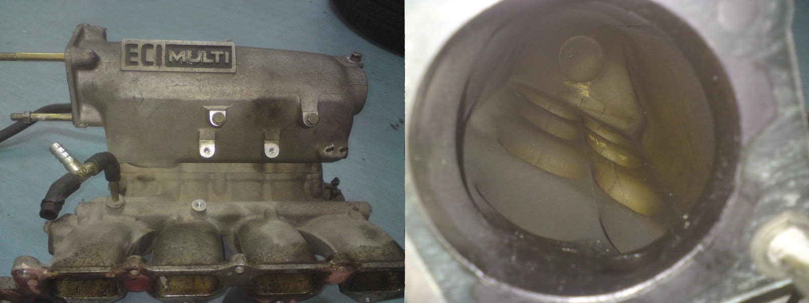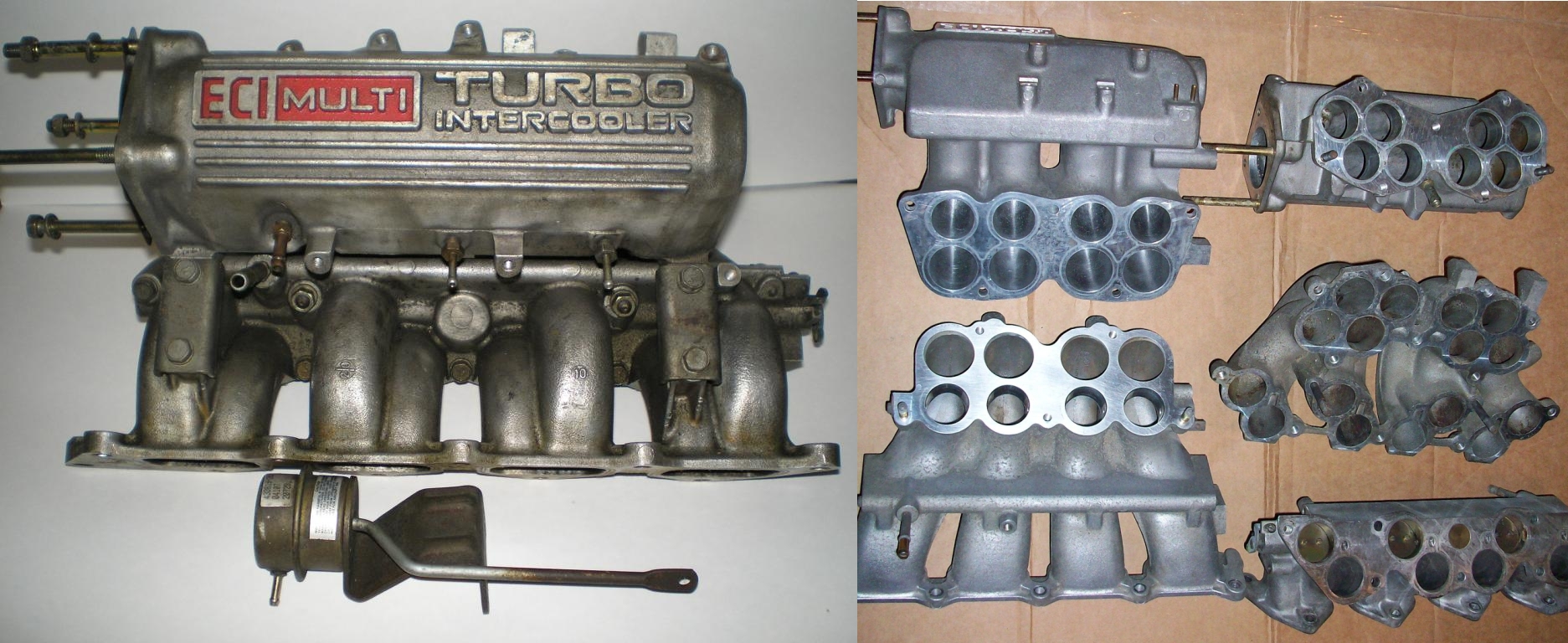 The function of this manifold is the same as the Cyclone except it is a two piece design instead of a 3 peice. It does not say Cyclone on the casting. This manifold is found in EDM Galant Dynamic-4, Galant AMG, JDM/EDM Galant GTi. They are rare items and also have actuated butterflies and split runners. These intake manifolds have a far smoother design with better shaped runners and a larger plenum volume. The top end powerband is a good bit better then the Turbo Cyclone but not much. This manifold is good for about 8000-9000 RPM or higher depending on camshaft.